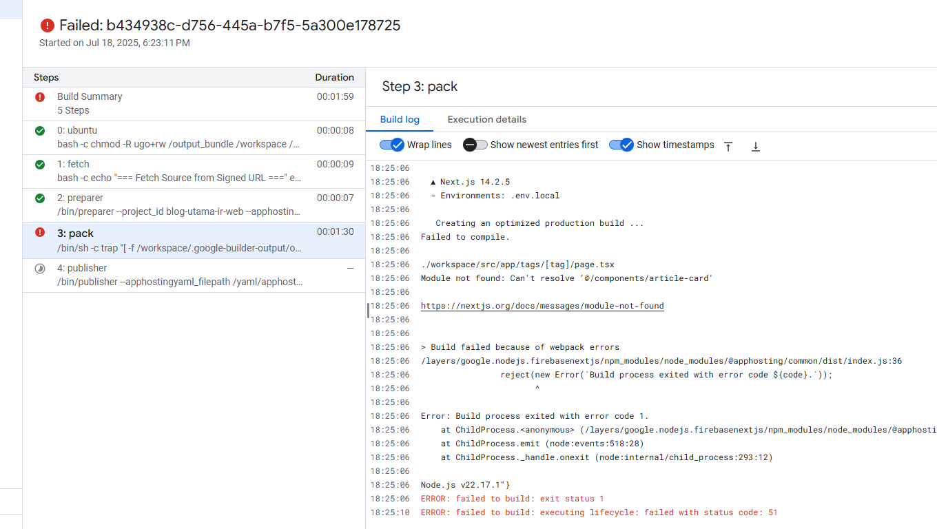 Di Firebase Studio, setelah build gagal, akan ada opsi untuk melihat detail atau log dari proses yang gagal tersebut.