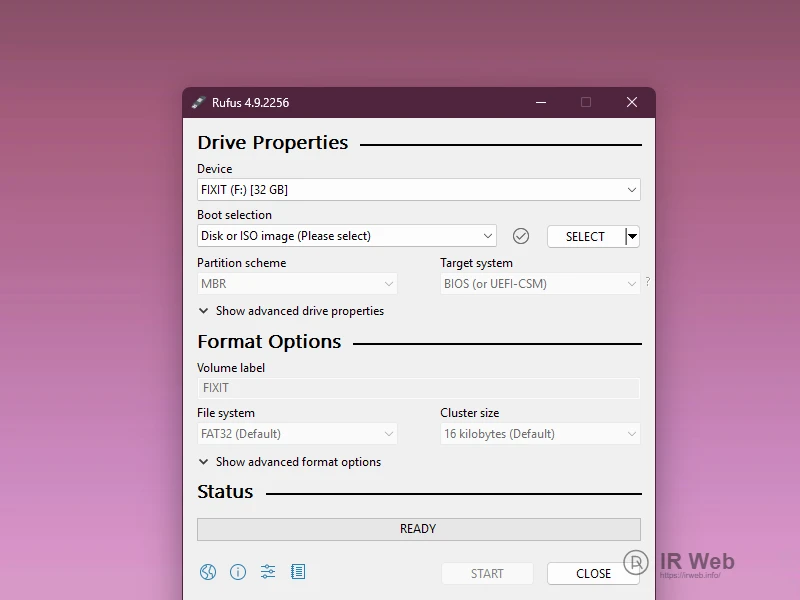 Buka Rufus & Pilih Perangkat Jalankan aplikasi Rufus yang sudah Anda unduh. Colokkan flashdisk Anda, dan Rufus akan mendeteksinya secara otomatis di bagian Device.