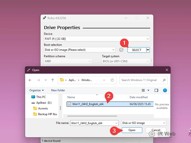 Pilih File ISO Windows 11 Di bagian Boot selection, klik tombol SELECT, lalu cari dan pilih file