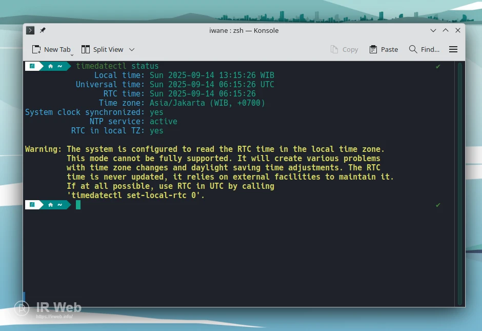Sekarang, perhatikan outputnya. Hasil yang benar akan menampilkan RTC in local TZ: yes. Ini menandakan konfigurasi Anda sudah berhasil dan Manjaro kini menggunakan waktu lokal, sama seperti Windows.